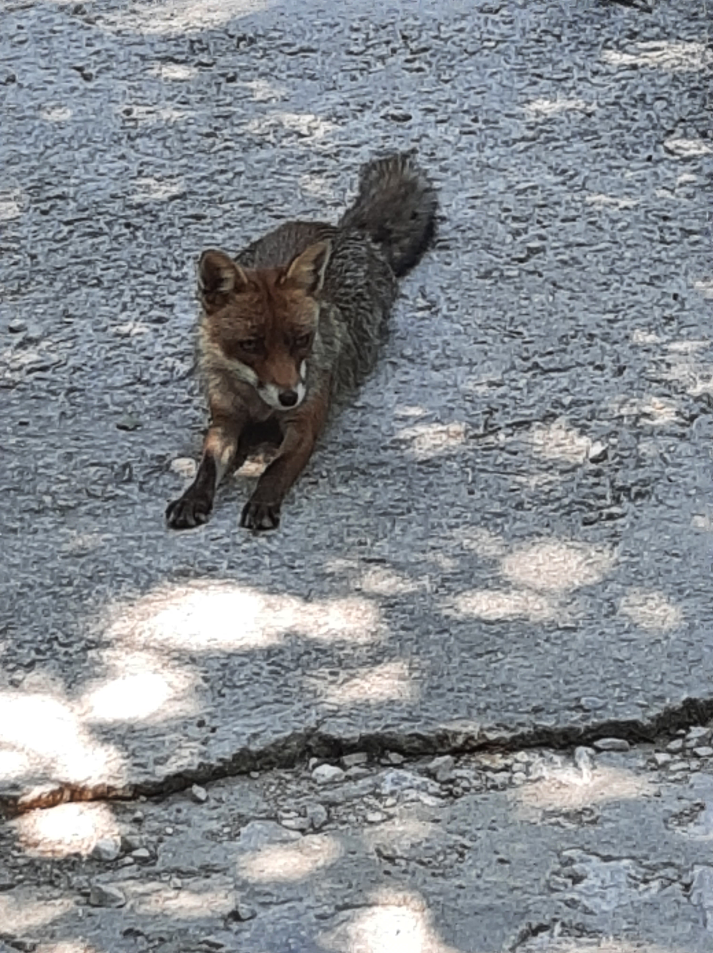 Un incontro quanto mai piacevole ci coglie di sorpresa. A Mola Secca ci viene incontro una volpina tenera tenera, subito battezzata Foxie, evidentemente abituata ai pellegrini di passaggio, che aspetta paziente con la solita aria di creatura affamata che il viandante di turno divida il pranzo con lei.