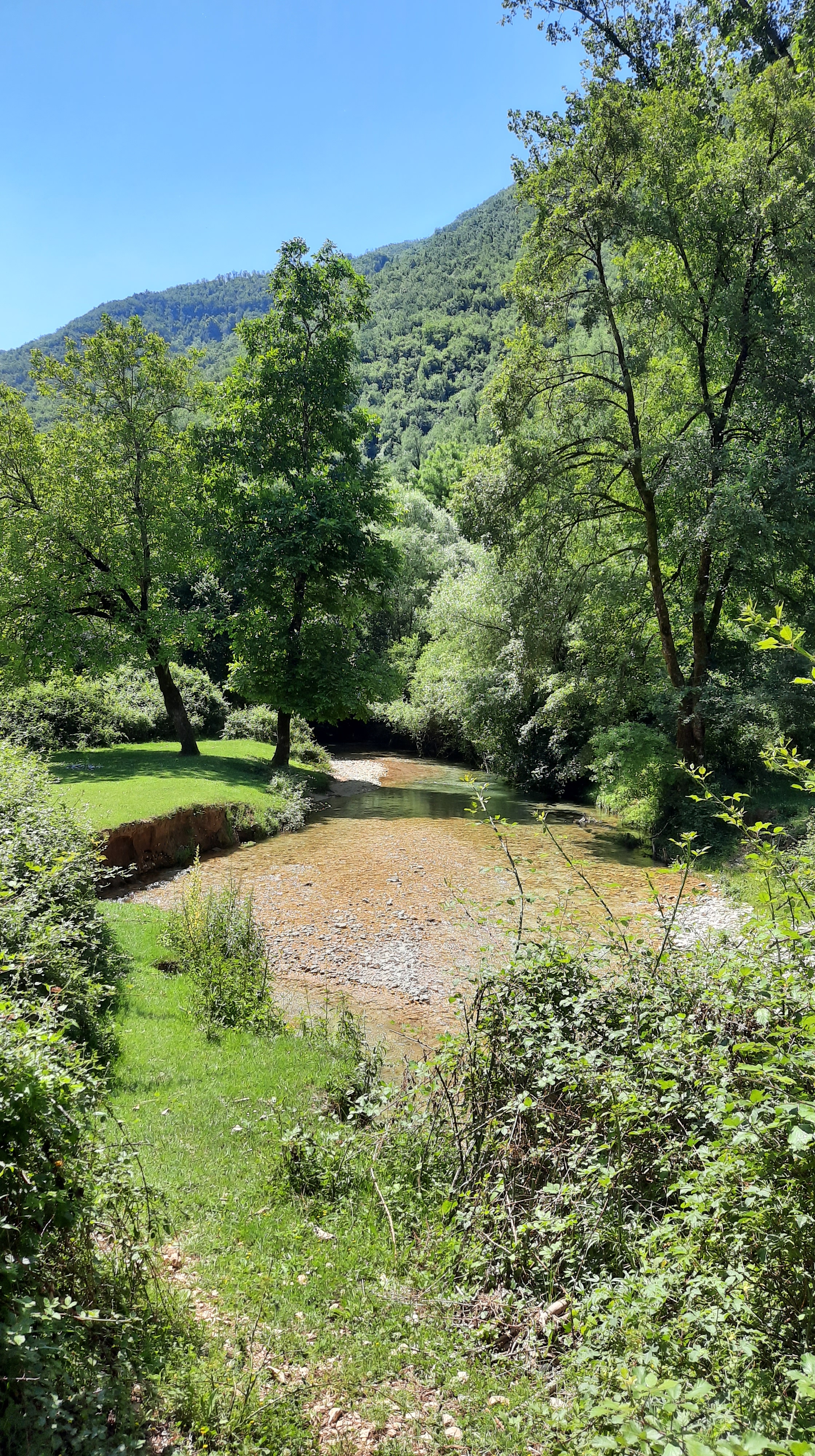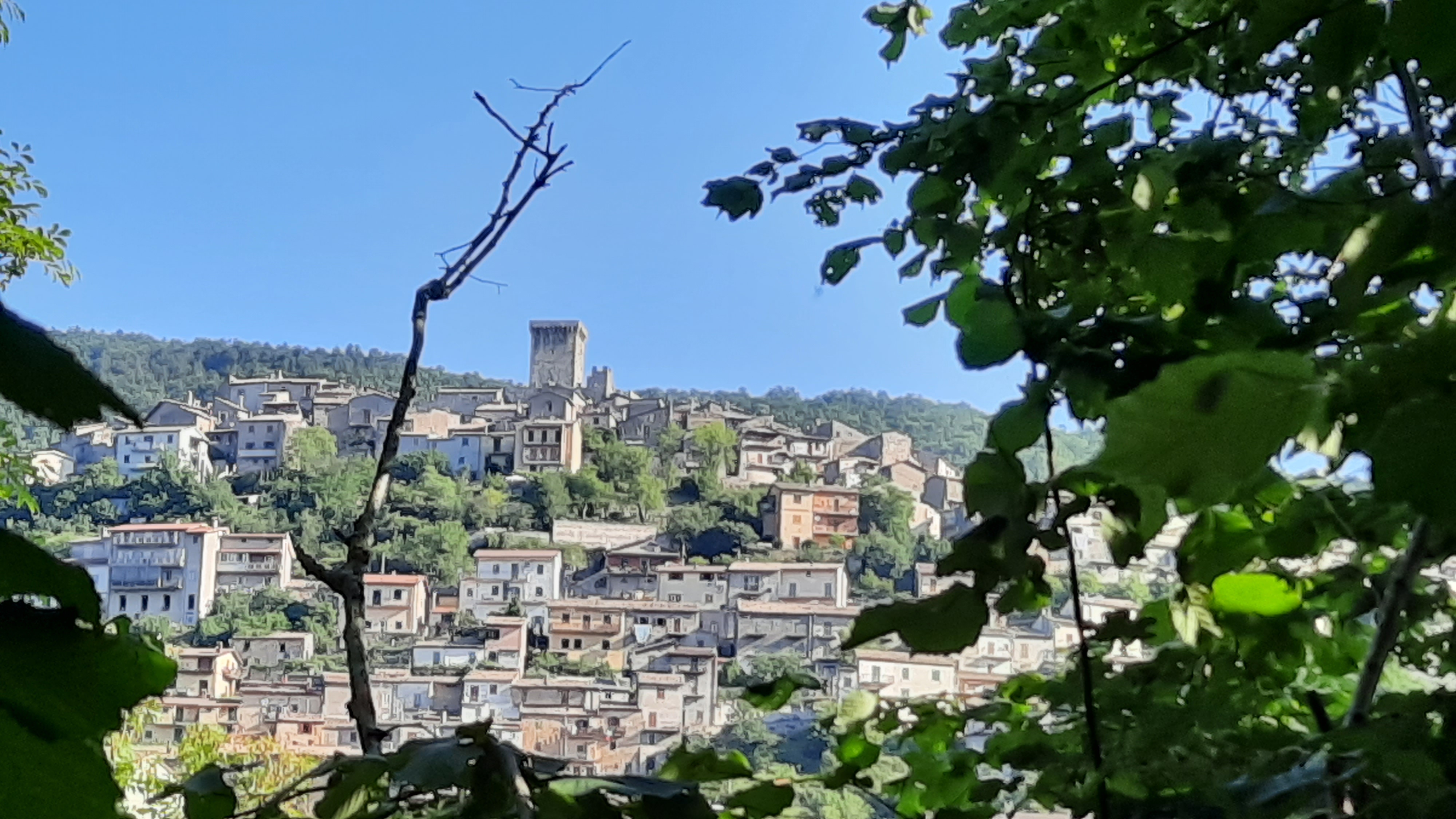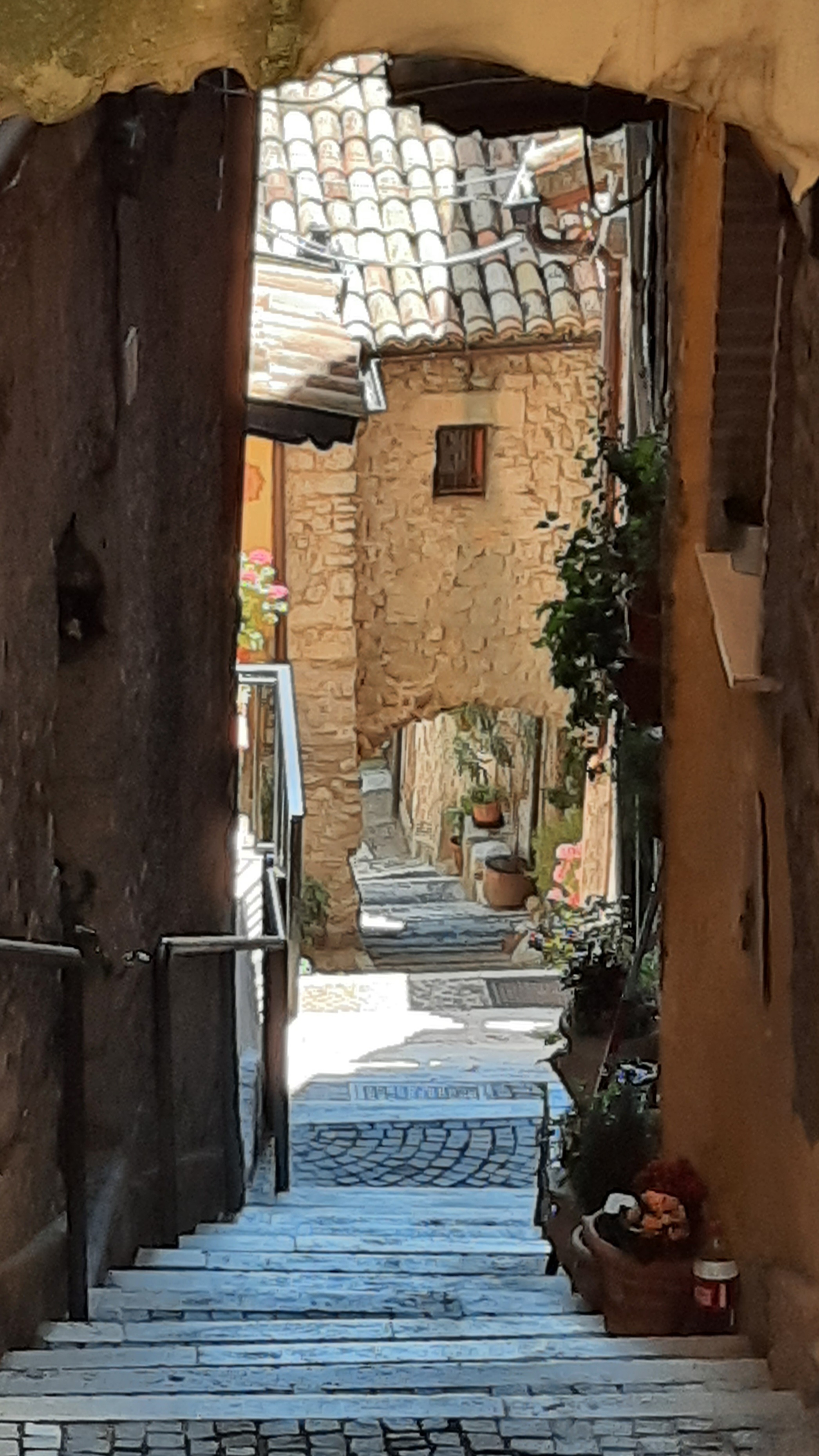 Subito dopo la cascata quando in teoria mancherebbero solo 6 km a Trevi, iniziano i dolori. A parte un paio di km da fare sulla carrozzabile, il resto del sentiero appare incolto e sommerso dai rovi, attraversando campi e con notevoli dislivelli da superare. Il caldo è asfissiante e finalmente arriviamo a Trevi, tipico paesotto sparso sul cocuzzolo dove per andare da A a B Devi sempre e comunque fare almeno 100 m di salita. Sono stanchissimo e appena arrivato all’alloggio per la notte mi appisolo, mentre Oscar riesce a trovare le forze per visitare il centro storico in compagnia di Luisa, la nostra giovane hospitalera che è anche professoressa di latino e greco al liceo classico di Anagni.