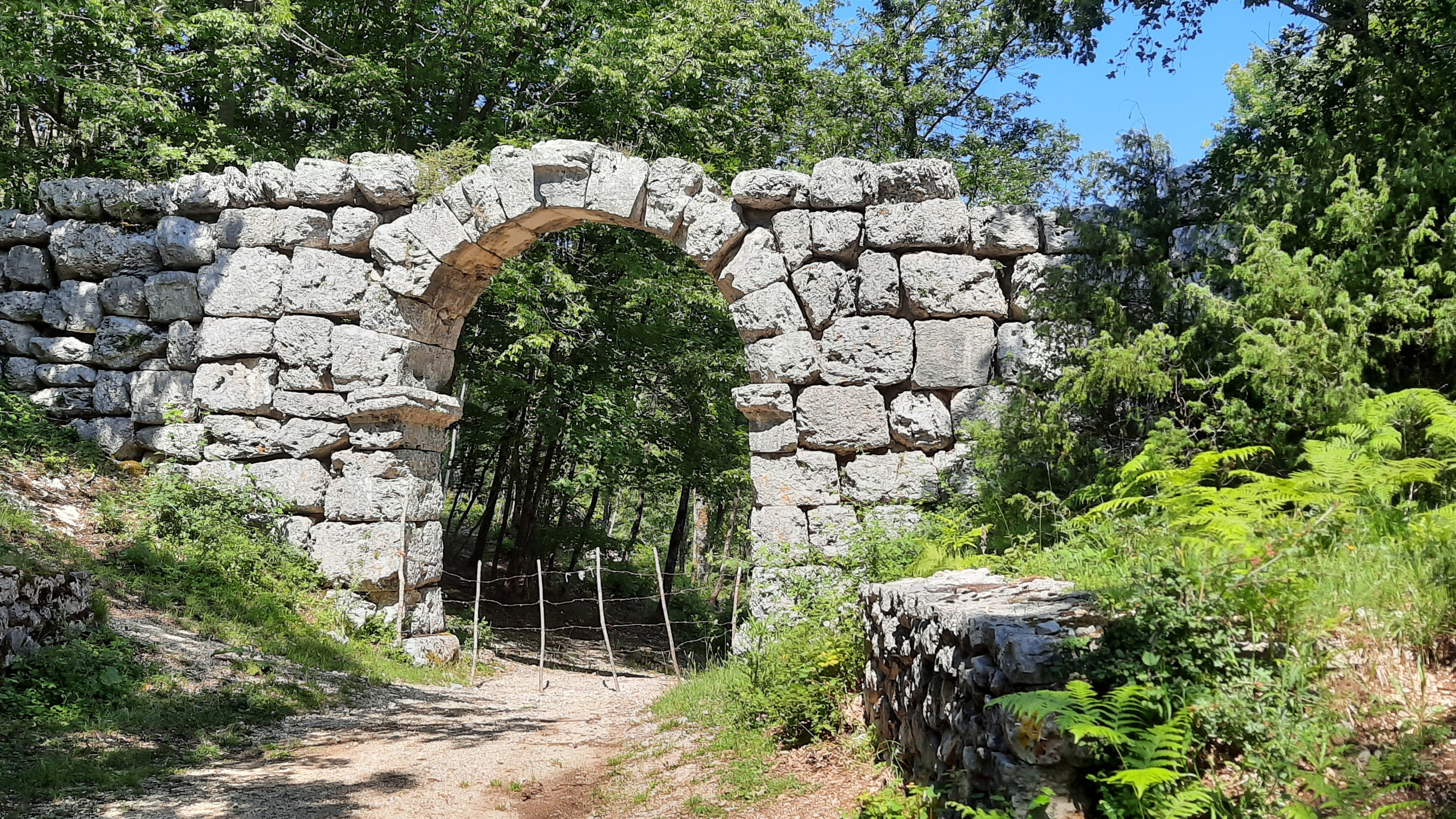 Secondo check-point all’arco di Trevi, postazione doganale d’epoca romana, sulla strada che conduceva a Treba, antico nome latino di Trevi. L’arco realizzato con pietre squadrate sorge solitario nel punto più alto del percorso, circa a 1000m di quota.