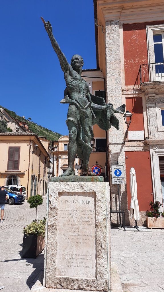 Arriviamo ad Arpino e Stefano ci scarica di fronte alla statua di Marco Tullio Cicerone, illustre personaggio nato proprio qui, il quale pero’ sembra che ci voglia cacciare indicando un punto lontano dalla parte di dove eravamo venuti.