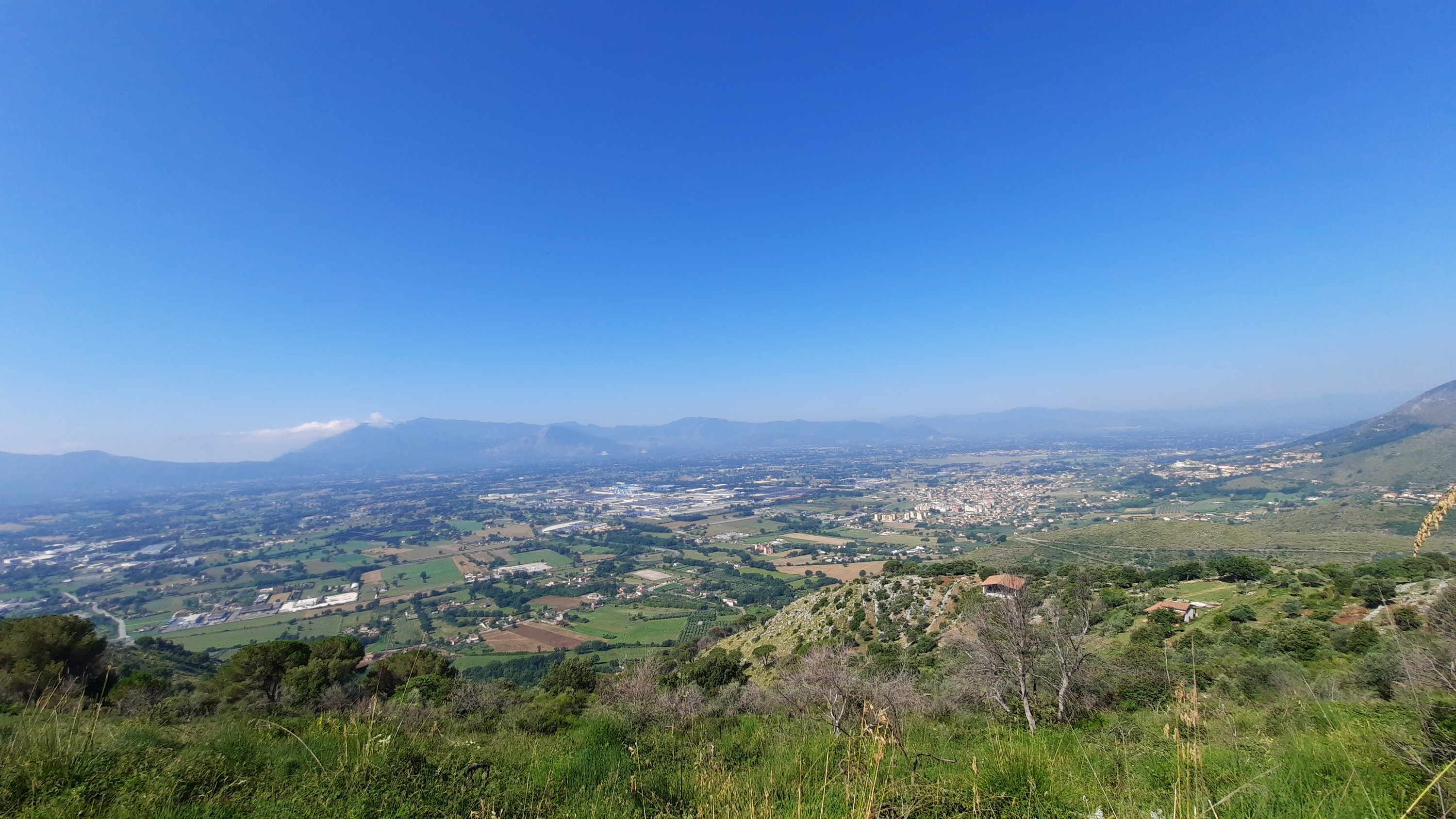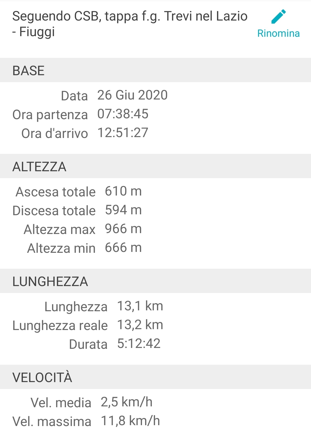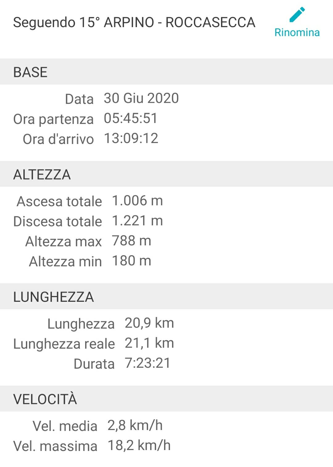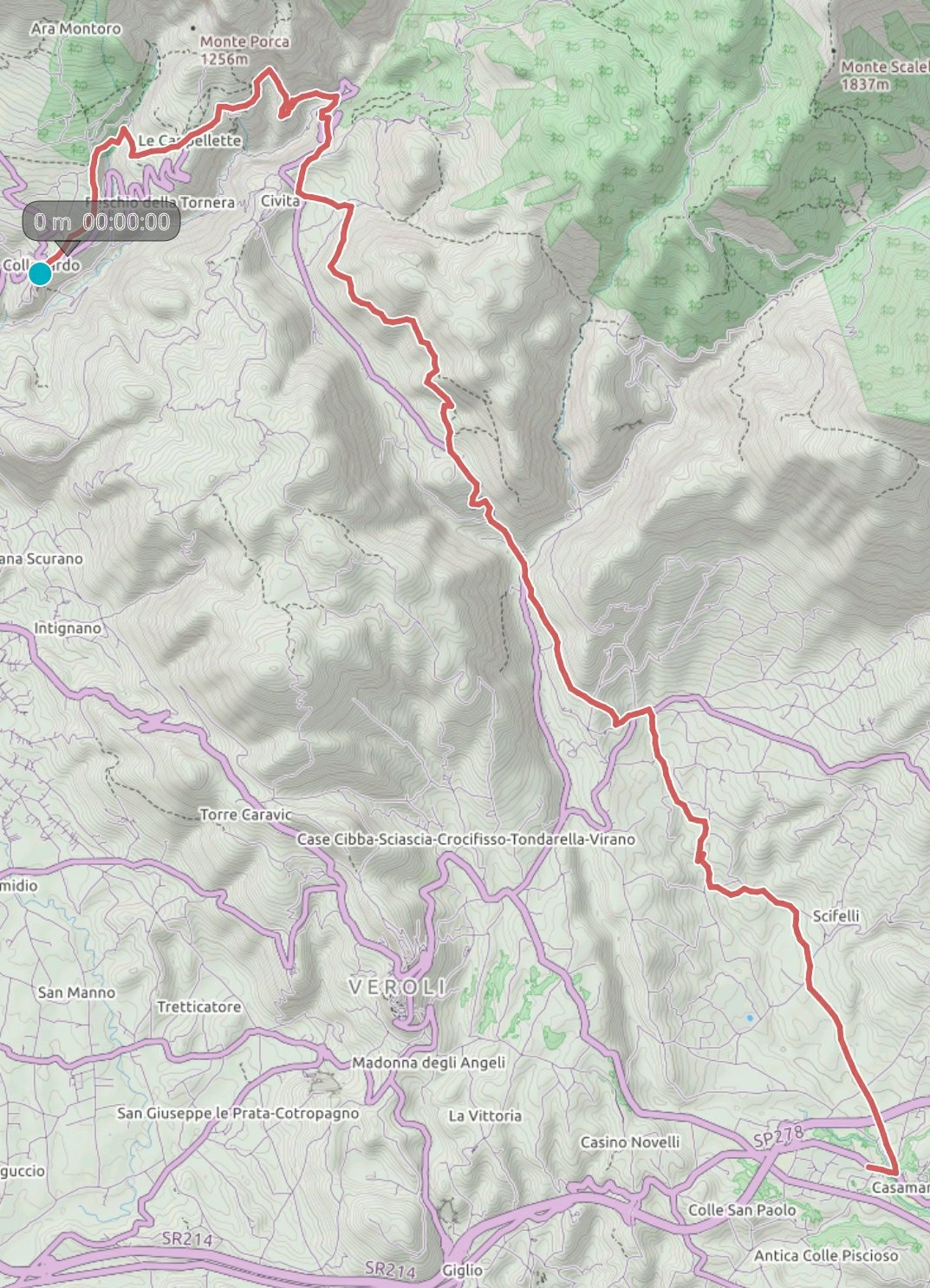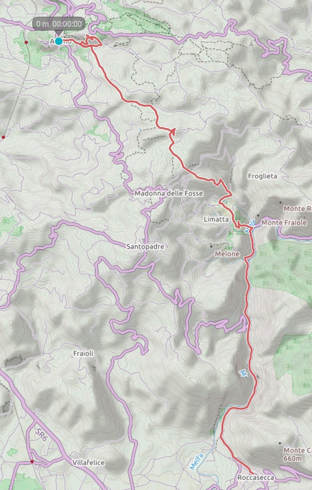 La tappa si preannuncia molto bella e di media difficoltà, ma decidiamo comunque di evitare il caldo il più possibile e pertanto mettiamo la sveglia alle 5, contando di partire alle 5:30. Alle 5:45 ci fermiamo dal bravo Massimo gestore del quasi centenario Caffe’ Italia per un cappuccino e brioche gommosa. Scambiamo due parole con Massimo, appassionato di cavalli e di turismo equestre, e ci racconta di come sia popolare da quelle parti andare in giro a cavallo. Considerata la natura dei sentieri, perlopiù sassosi dei monti Ernici che circondano la piana di Arpino, vedere persone a cavallo non stonerebbe per niente con l’armonia del paesaggio. Noi comunque non ne abbiamo ancora visto in giro anche se una certa qual presenza e’ rivelata dalle abbondanti deiezioni sul percorso.
