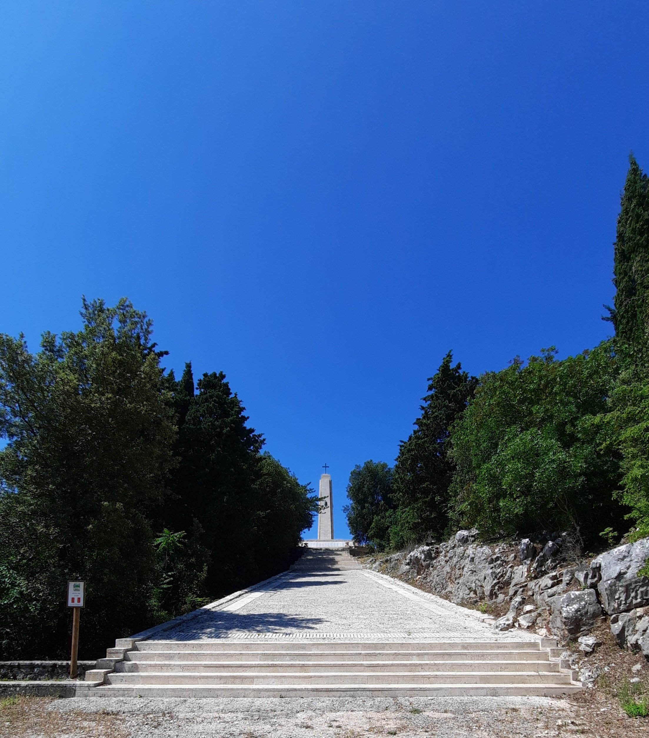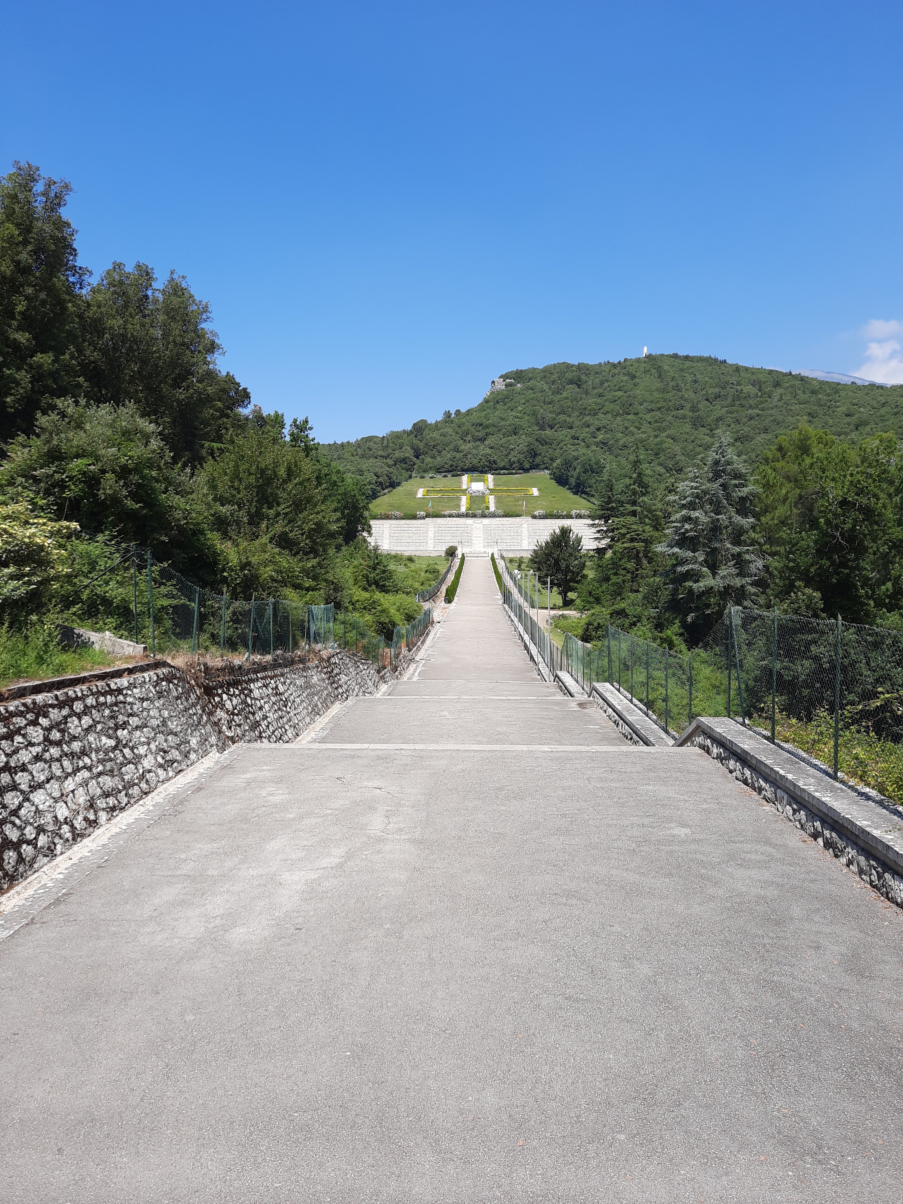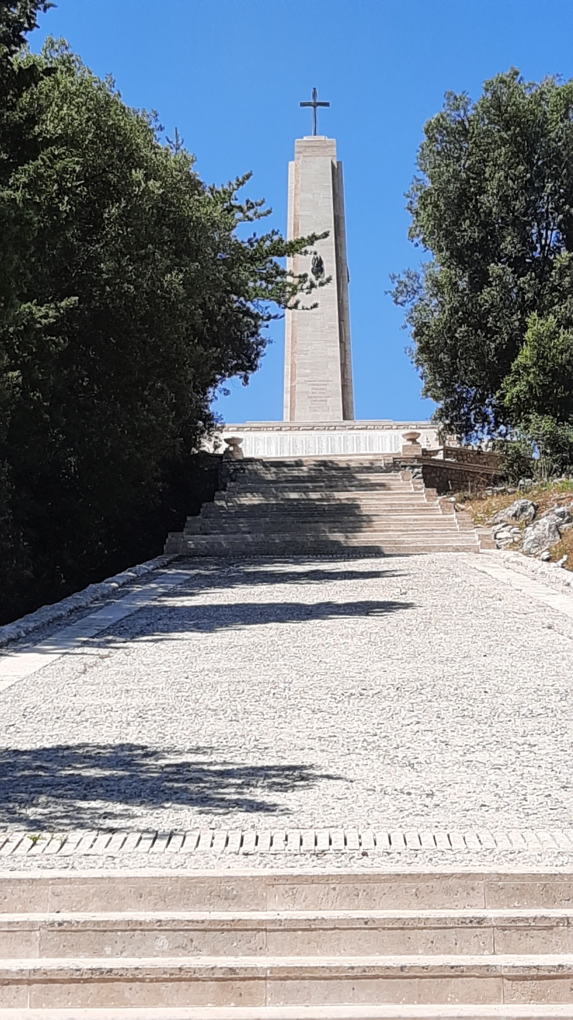 Di lì a poco, mi chiama il buon Tommaso dicendomi che le tenaci signore di Reggio Emilia si trovano disorientate in un punto ben preciso del percorso e non sono sicure sulla strada. Consulto rapidamente il mio GPS e taglio per il bosco improvvisando un sentiero per intercettare la strada più a monte, e così riesco a raggiungere Angela e Stefania presso la Masseria Albaneta, e decidiamo di proseguire insieme. Esprimo il mio interesse a visitare l’obelisco eretto dal Governo Polacco sul punto più alto del colle a commemorazione del sacrificio di 1500 soldati polacchi che per primi giunsero il 18 maggio 1944 sulle macerie dell’Abbazia difesa strenuamente da un gruppo di paracadutisti tedeschi che avevano occupato le rovine dopo i bombardamenti alleati del febbraio 1944. La commozione per la vicenda, e la bellezza del paesaggio che si scorge da questo nido d’aquila, è intensa. Sotto l’obelisco si trova il cimitero polacco dove gli eroici soldati sono sepolti, e dove anche il generale polacco Anders che li guidò alla vittoria volle essere sepolto insieme alla moglie nel 1970.