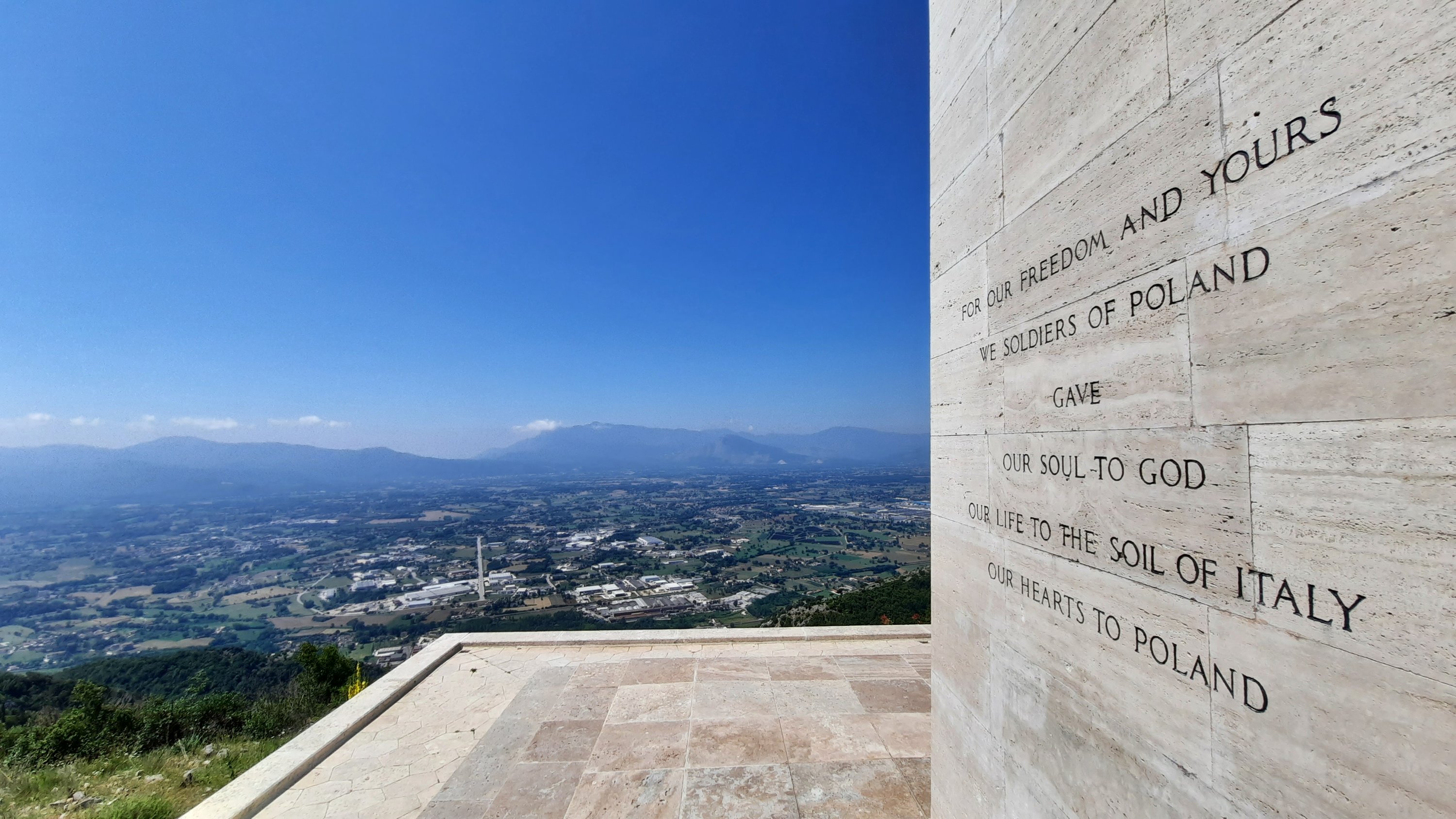 La scritta dice: “Per la nostra e la vostra libertà, noi soldati di Polonia, abbiamo reso le nostre anime a Dio, i nostri corpi alla terra d’Italia, e i nostri cuori alla Polonia“