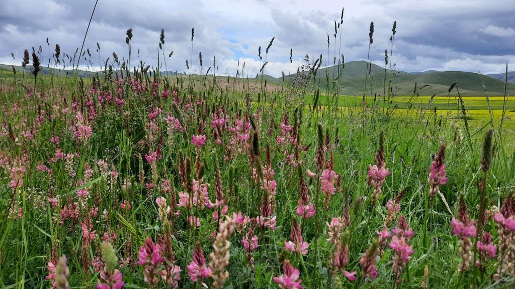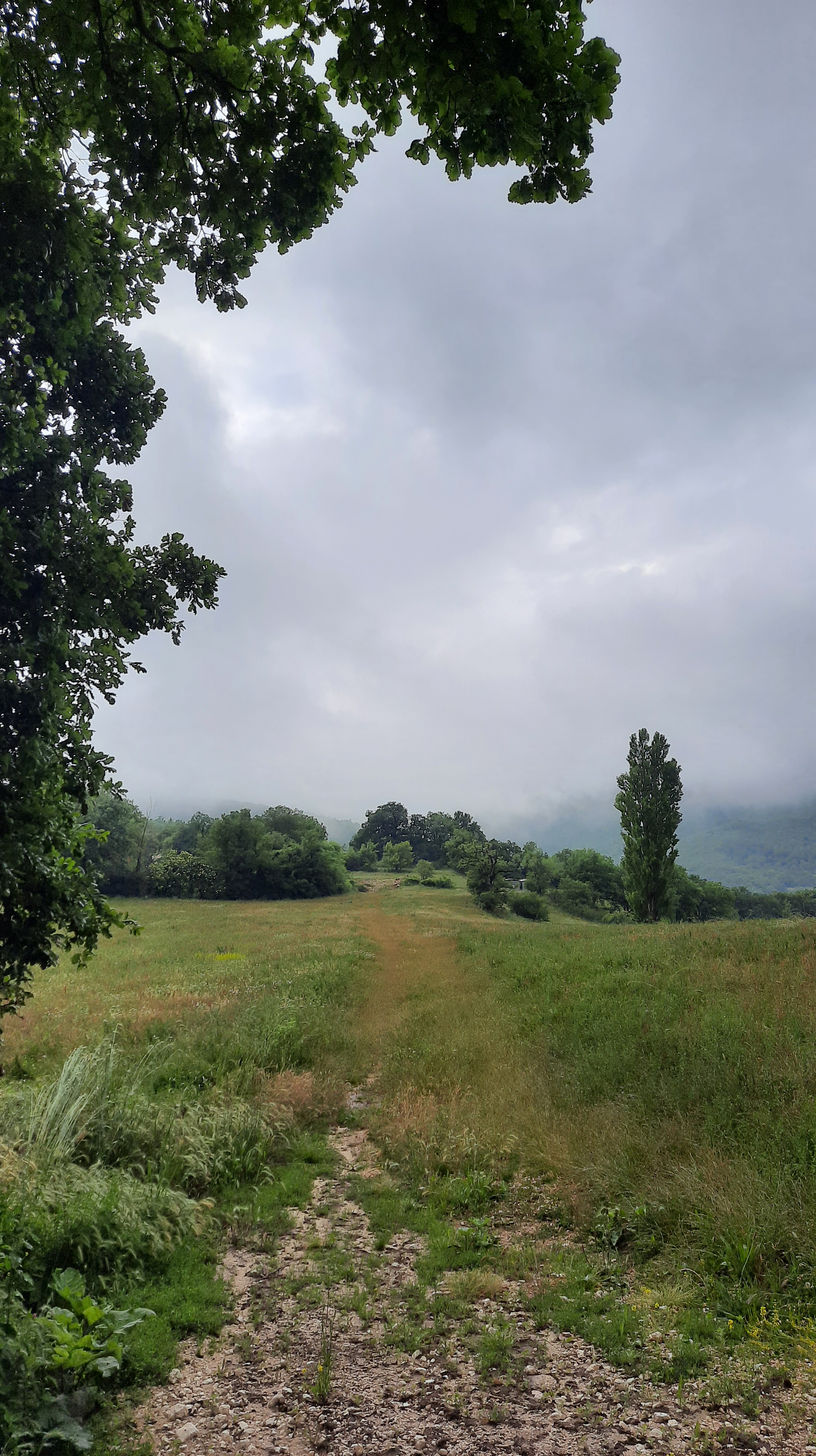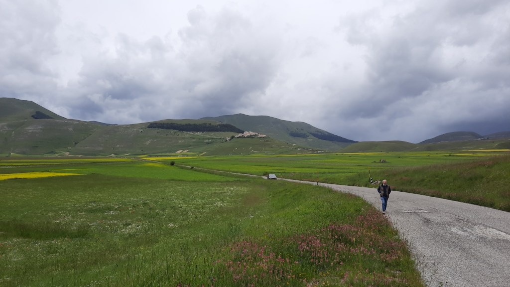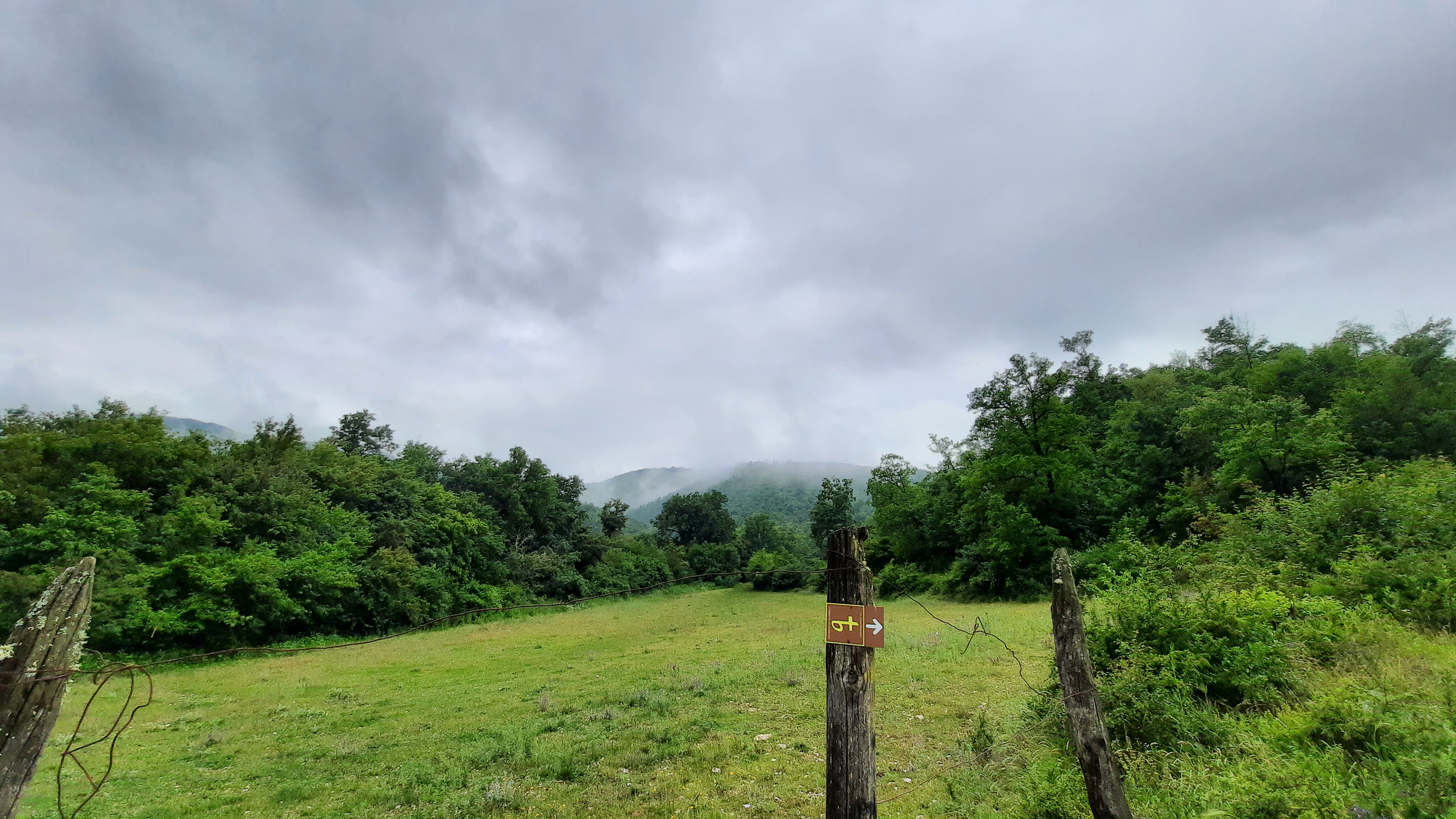 Proseguiamo in direzione di Monteleone per la strada e vari sentieri che secondo la guida sono “facili” ma in realtà si rivelano subito un po’ fastidiosi sia per i continui saliscendi molto ripidi sia e soprattutto per il terreno intriso di super-fango in seguito alle intense piogge pomeridiane. Alla fine, usciti dal bosco scorgiamo più giù l’agriturismo dove passeremo la notte proprio nel momento in cui il cielo si rabbuia improvvisamente ed inizia a piovere. Ci infiliamo di corsa nella sala da pranzo, dove la signora Piera ci mette in tavola due belle zuppe fumanti di roveja, detta anche pisello dei campi o robiglio, una varietà di pisello importato in Europa dal Medio Oriente, conosciuto fin dal Neolitico, ma ultimamente praticamente scomparso.