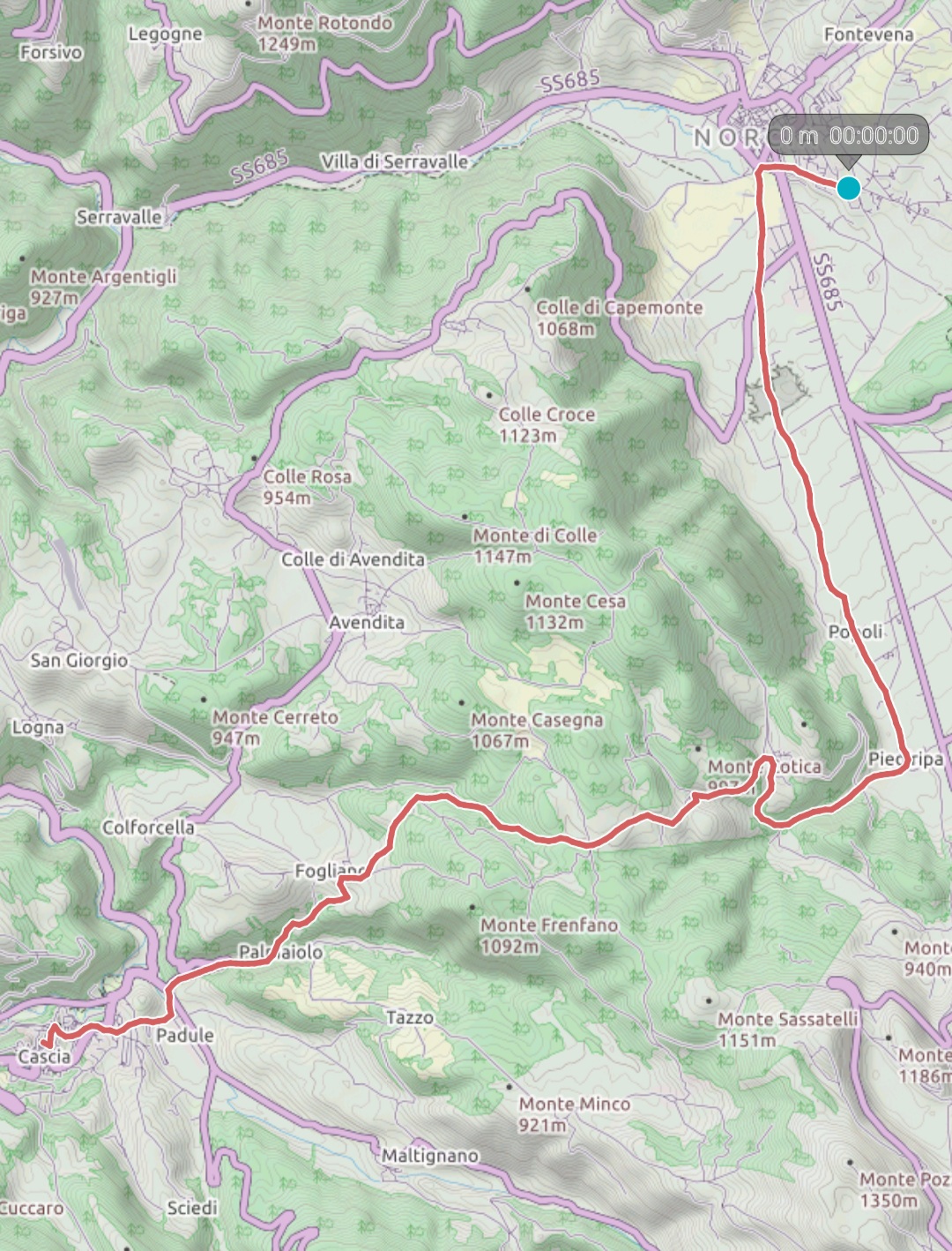 Dopo una colazione sommaria in un bar convenzionato con il nostro B&B (da fare sospettare che la seconda B significhi Bar anziché Breakfast), ci allontaniamo rapidamente da Cascia senza molti rimpianti. Lavori di manutenzione ANAS bloccano purtroppo l’accesso al sentiero di Santa Rita e ci costringono ad una lunga deviazione sulla strada asfaltata per fortuna poco trafficata che risale il percorso tortuoso del torrente Corno.